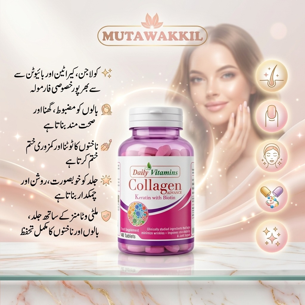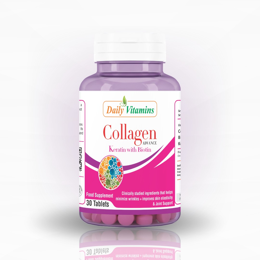 Collagen Advance is a premium beauty supplement designed to support healthy skin, strong hair, and durable nails. With a powerful blend of Collagen, Biotin, and Keratin, it helps enhance your natural beauty from within.